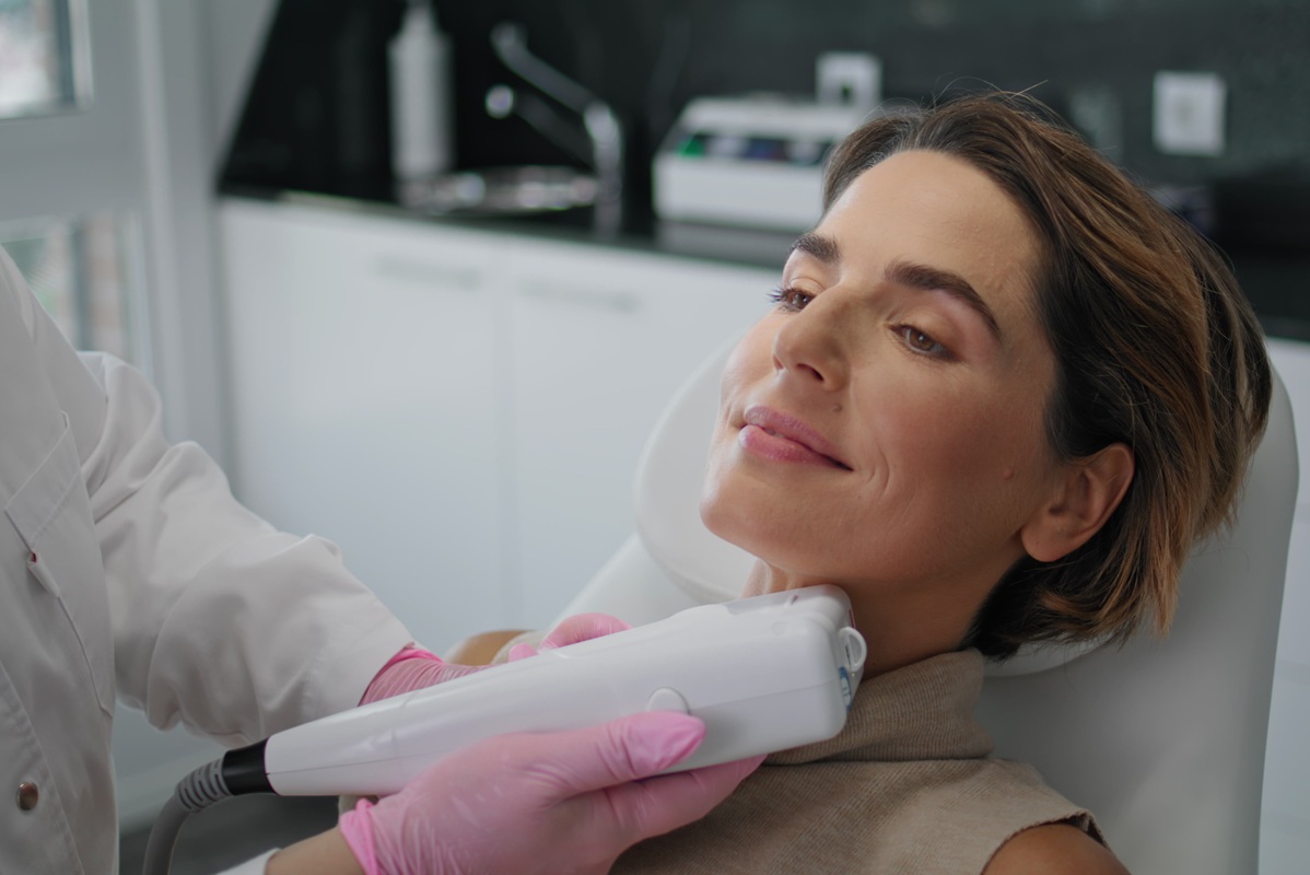 A non-surgical skin tightening treatment using a handheld device that combines Radio Frequency (RF) and infrared light to stimulate collagen, lift skin, and reduce wrinkles for a more toned, youthful appearance.